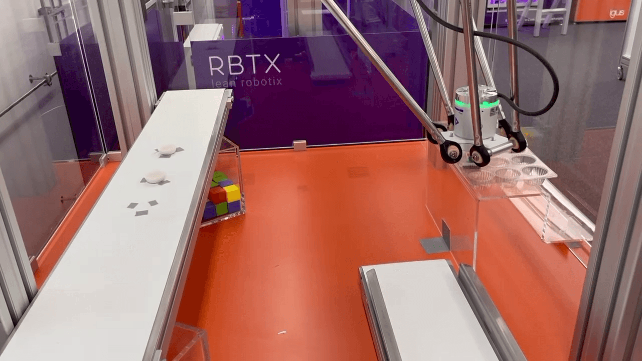 In this customer test, a Delta robot equipped with a mounted Cobot pump effectively automated a portion of the packaging process. The robot precisely picks up chocolates from a moving conveyor belt and places them into their designated packaging, ensuring consistency and efficiency. This solution demonstrates how partial automation can streamline workflows in the packaging sector, maintaining reliability while reducing manual effort. The Delta robot’s precision and speed make it ideal for applications requiring repetitive pick-and-place tasks, especially in food handling environments.